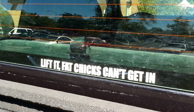Speaking of decals, I just had to snap this sticker on the back of a huge, lifted truck…