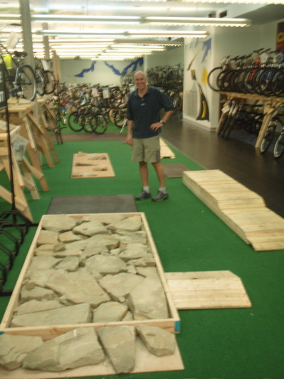 On the 2nd floor, the bike shop had a test track with all kinds of obstacles and 3 of us fit on the Big Dummy- a bike designed to carry 400lbs load- and re raced it around the test track. Laughing our heads off. Ok, there was some fine micro brew beer involved. We even rode over the teeter totter. Really, its on TV. Guess who was the fastest driver?